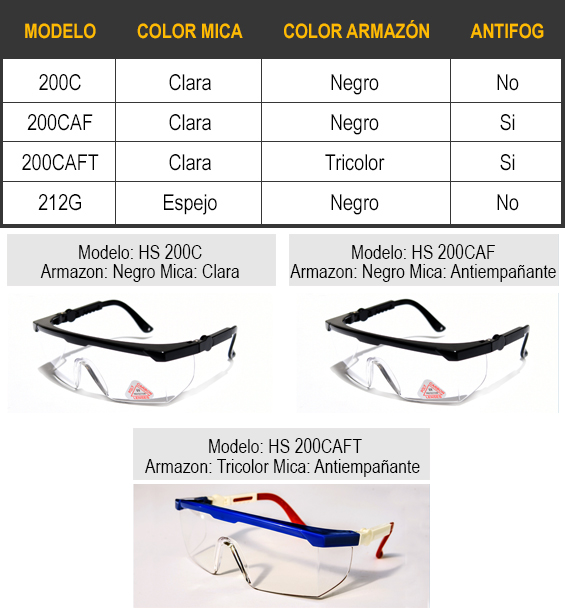 • Familia: 200 • Material: 100% Policarbonato • Protección de mica: Antifog y Antirrayadura • Pasta Nasal: Universal y una sola pieza • Armazón: Nylon resistente. Racket 5 posiciones • Certificación: ANSI Z81+