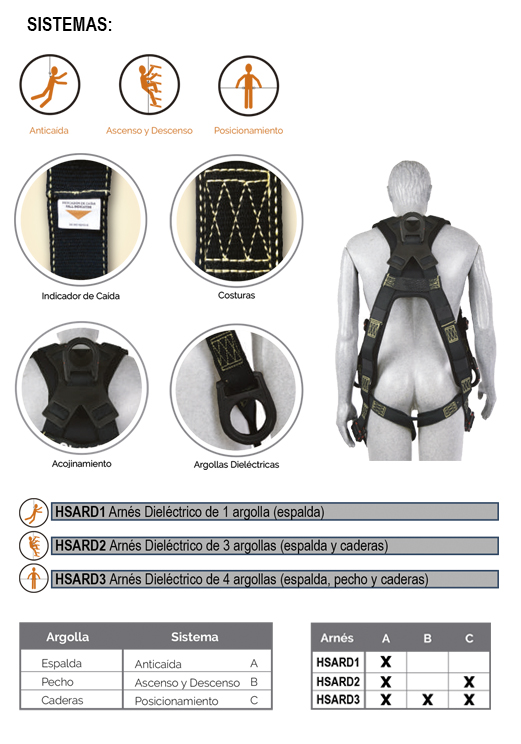 • Nuestro Arnés contra caídas con argolla en la Espalda y Argollas en Cadera está fabricado de Nylon y hebillas y conexiones 100% dieléctricas, Cuenta con 5 puntos de ajuste en el torso, pecho y piernas logrando la mayor protección y confort.